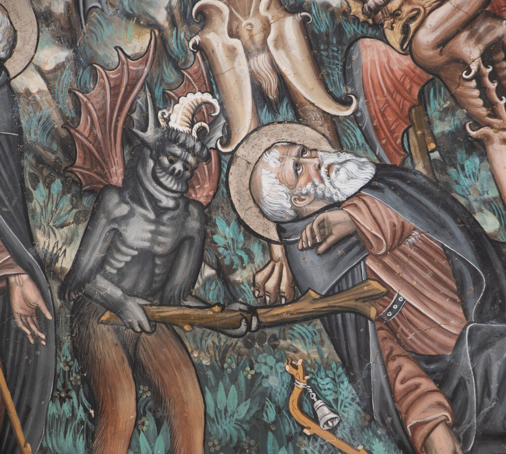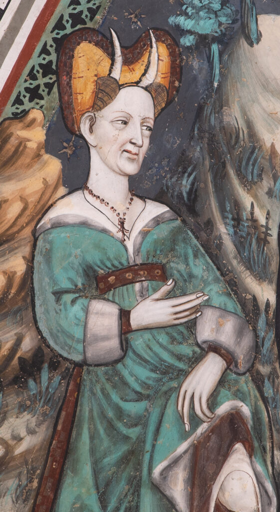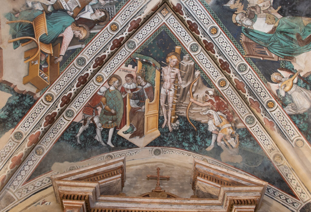 Gli affreschi ricoprono molta parte della superficie muraria e si legano a diverse campagne decorative. Tra le molte scene affrescate, sono di particolare pregio la volta del presbiterio con il Martirio di san Sebastiano (1440-1450), opera di Guglielmetto Fantini, pittore afferente all’ambito di Giacomo Jaquerio, e la grande Crocifissione dipinta sulla parete di fondo, firmata da Antonius de Manzaniis a fine Quattrocento. Nella prima cappella a destra, dedicata ai santi Lorenzo e Stefano, primi due martiri del cristianesimo, si trovano tre registri sovrapposti con la Lapidazione di santo Stefano, il Martirio di san Lorenzo e la sua Flagellazione alla colonna, datati tra il 1460 ed il 1470. Nella seconda cappella lo pseudo Jacopino Longo ha affrescato la leggenda medievale legata ai pellegrini di San Domingo de la Calzada, mentre in controfacciata Jacopino Longo nel 1508 ha dipinto una mirabile Natività.