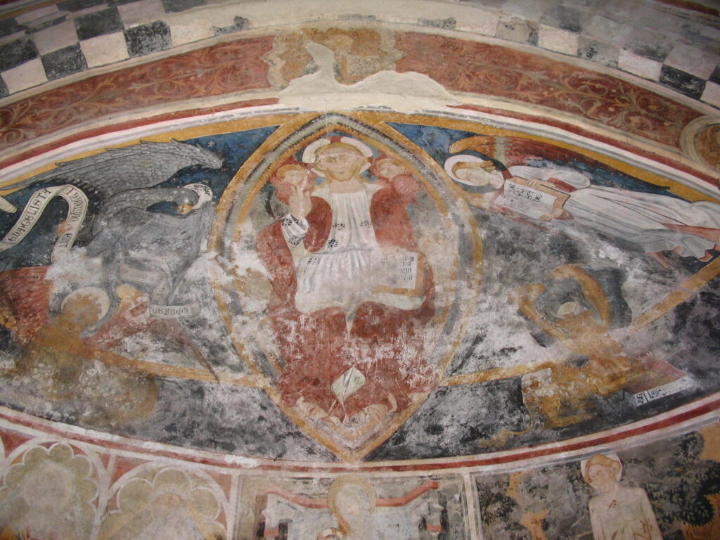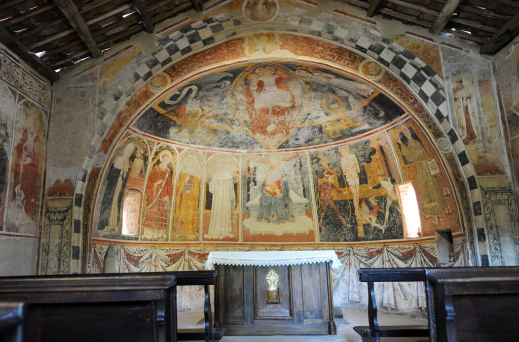 Nel catino absidale, la mandorla con il Cristo Giudice benedicente tra gli angeli è circondata dai simboli dei quattro evangelisti. Sulla parete absidale al centro, seduta in trono, la Vergine con Bambino. Ai lati segue una serie di Santi: Caterina da Siena che adora il Cristo nel sepolcro (Cristo di Pietà), Lorenzo, Pietro, Bernardo d’Aosta o forse Giacomo di Compostella protettori dei pellegrini, Bernardino da Siena e il martirio di S. Sebastiano.