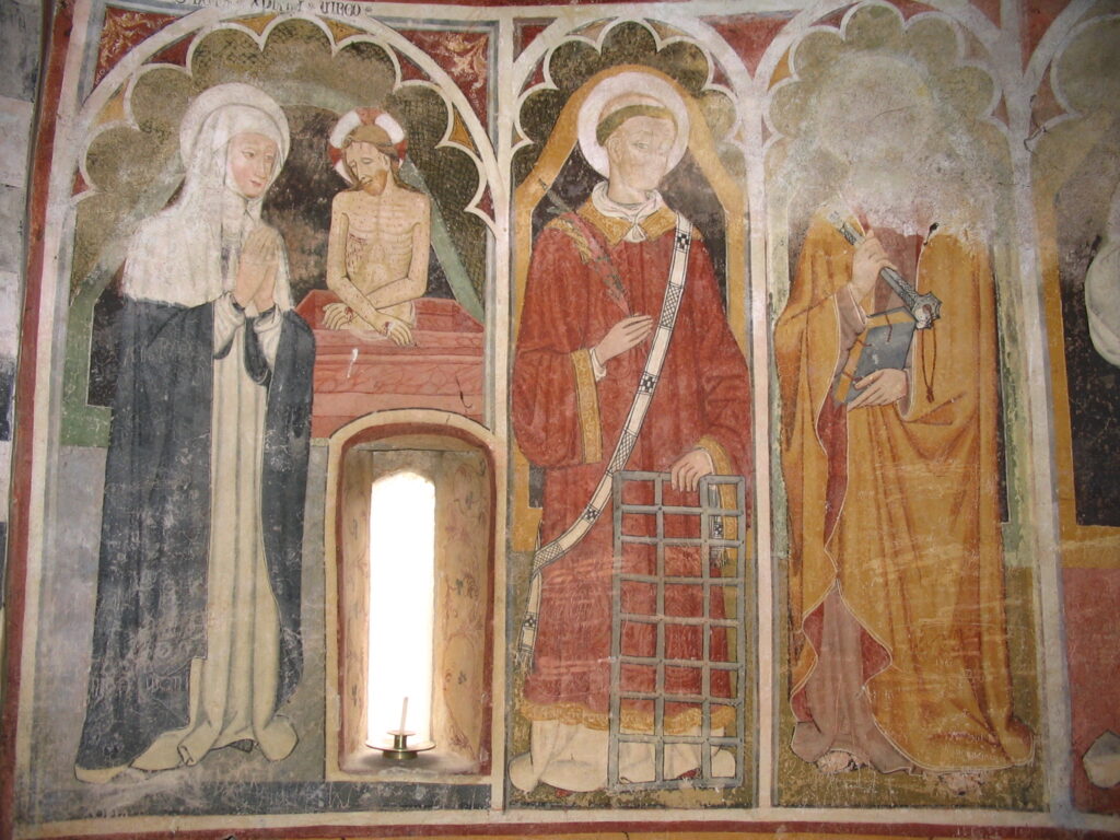 Nella parete di destra: San Martino e il mendicante e sotto San Michele che pesa le anime.