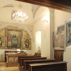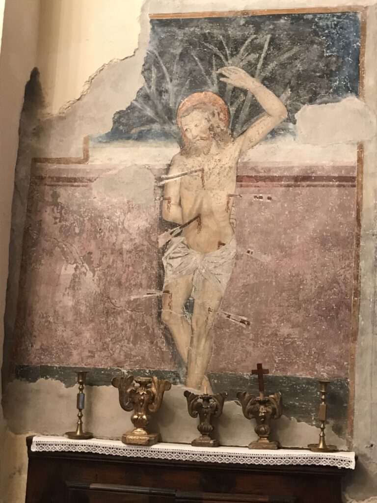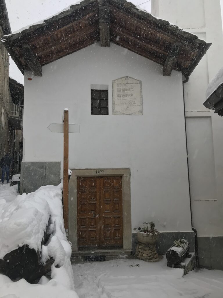 La cappella, dedicata a San Biagio Vescovo e a San Pietro, svetta tra i dedali di stretti vicoli della borgata Deveys di Exilles. La sua costruzione può essere datata almeno alla seconda metà del XV secolo; essa ha subito nel corso del tempo numerosi interventi di manutenzione e restauro, l’ultimo dei quali, nel 2009, ha ricompreso il recupero dei cicli affrescati presenti all’interno dell’edificio. La cappella presenta esternamente semplici pareti intonacate coperte da un tetto in lose a due falde; il campanile si innesta sul lato destro della facciata. All’interno la struttura è costituita da un’unica navata voltata a botte terminante in una stretta abside quadrangolare e munita di tribuna lignea in controfacciata. La parete di fondo è decorata dal retablo barocco, intagliato e dipinto, al centro del quale è posta la tela raffigurante la Madonna col Bambino tra i santi Biagio e Pietro Apostolo. Lungo la parete meridionale dell’aula sono stati riportati alla luce quattro riquadri affrescati, resti di un più vasto ciclo affrescato dedicato alle scene della vita di San Biagio. Le scene superstiti si dipanano ai lati e negli sguanci di una finestrella: da sinistra a destra si riconoscono un San Sebastiano trafitto dalle frecce, la Madonna col Bambino, Santa Lucia, Santa Margherita. La scena del martirio di San Sebastiano presenta il santo trafitto da sette frecce e rivestito del solo perizoma, legato ad un albero frondoso che si staglia su un muro dal colore rosato. Lo sfondo blu intenso sfuma, sulla linea dell’orizzonte, verso un bianco vivido. Alla destra del San Sebastiano, nello sguancio della finestra, è presente la Madonna col Bambino, dove alla statica ieraticità della Vergine si contrappone la vivacità del Bambino che tiene nella mano destra un uccellino, simbolo della passione. Contrapposta a questa immagine, nello sguancio destro, è presente la figura di Santa Lucia con i suoi attributi: gli occhi nel piatto e la spada del martirio. Da ultimo, è visibile sulla destra la figura di Santa Margherita in preghiera nell’atto di uscire dal ventre del drago. L’anonimo frescante che realizzò i cicli della cappella del Deveys è avvicinato, per motivi stilistici, al cosiddetto Maestro di Savoulx, attivo in alta Valle di Susa nei primi due decenni del Cinquecento.
