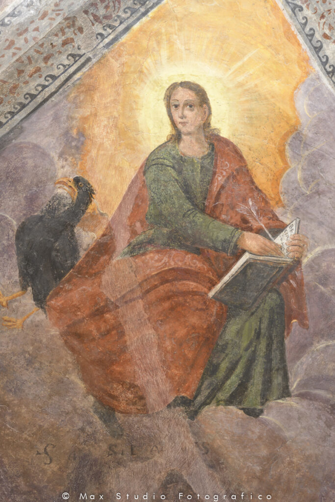 Lo svolgimento narrativo ha inizio sulla volta dove sono affrescati gli Evangelisti, intenti a comporre le Sacre Scritture da cui si apprende l’annuncio della salvezza. Sono loro che introducono il fedele nel mistero della Pasqua. Al centro dei costoloni della volta è poi collocata una stella ad otto punte: è un centro sacro atto a richiamare l’ottavo giorno.