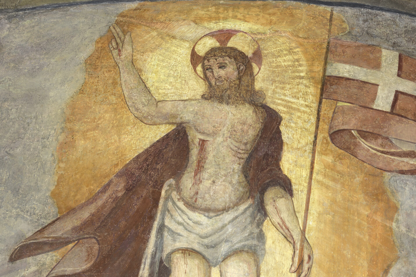 Sulla parete occidentale si trova una lunetta con la raffigurazione della Sindone, che tratta della passione e della morte di Cristo. Sulla quella orientale è invece dipinta la Resurrezione. Il Risorto troneggia al centro della scena con un’esplosione luminosa, la cui fonte è Cristo stesso.