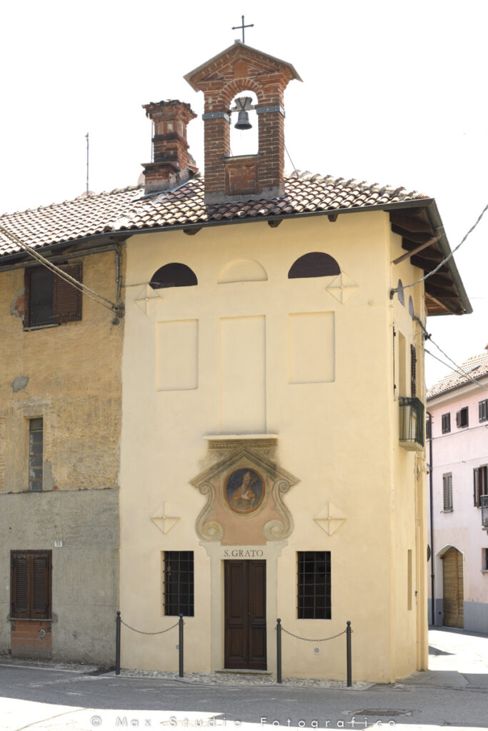 La cappella di San Grato sorge all’interno del centro di Nole, a pochi passi dalla parrocchia di San Vincenzo martire. La dedicazione al vescovo di Aosta, invocato contro il maltempo per la protezione delle coltivazioni, ben si accorderebbe alla posizione originaria della cappella, fuori dall’abitato tra i campi della piana canavesana.
