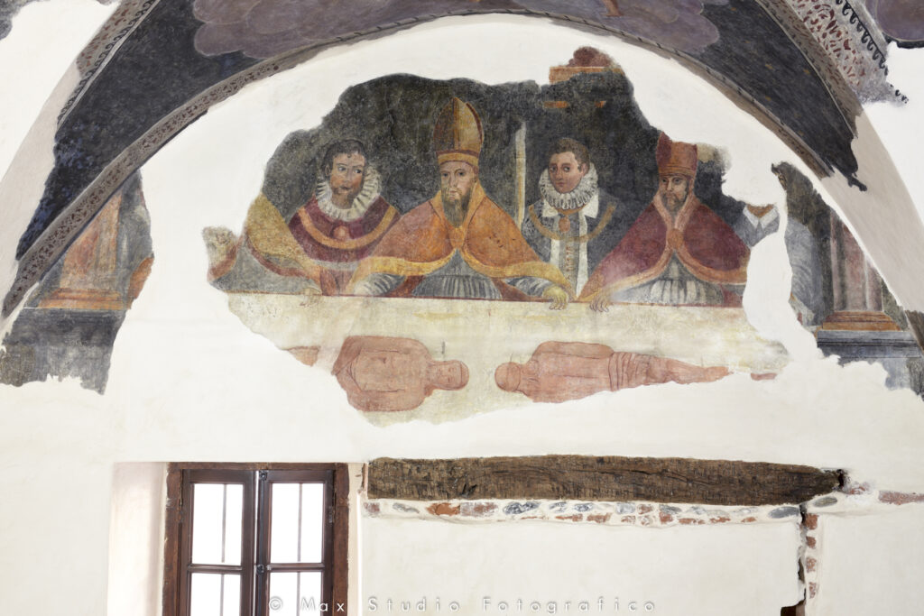 Varcata la soglia d’ingresso della cappella, si dischiude uno scrigno affrescato risalente agli anni ottanta del Cinquecento. Il ciclo pittorico mette al centro il “mistero pasquale”, ovvero la proclamazione della morte e risurrezione di Gesù Cristo. E’ un’iconografia rara nel territorio collocato a nord di Torino.