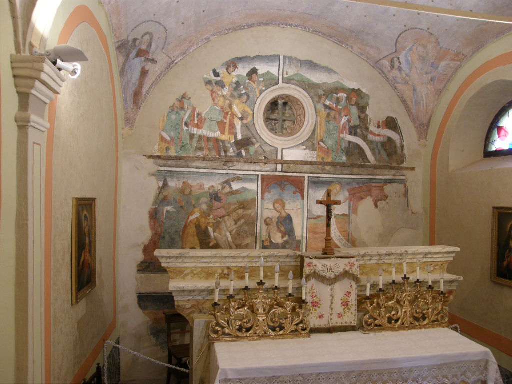 L’occasione della scoperta del ciclo si deve alla volontà della comunità locale di far restaurare la pala d’altare settecentesca. Rimossa la tela, infatti, è fortunosamente emersa la Madonna col Bambino, risparmiata alle imbiancature seicentesche, testimonianza di una precoce derivazione locale dalla pittura di Antoine de Lohny, pittore itinerante poi attivo per i Savoia nel XV secolo. Successivi interventi di restauro hanno permesso di recuperare quattro episodi di un più ampio affresco, realizzato nel presbiterio, con le Storie di San Sebastiano eseguito da Bartolomeo Serra tra il 1470 e il 1480. Gli episodi conservatesi sono il Martirio dei Compagni di San Sebastiano, San Sebastiano condotto presso Diocleziano, il Martirio di San Sebastiano e l’Apparizione del Santo a Lucina, la cui figura è andata in parte perduta.