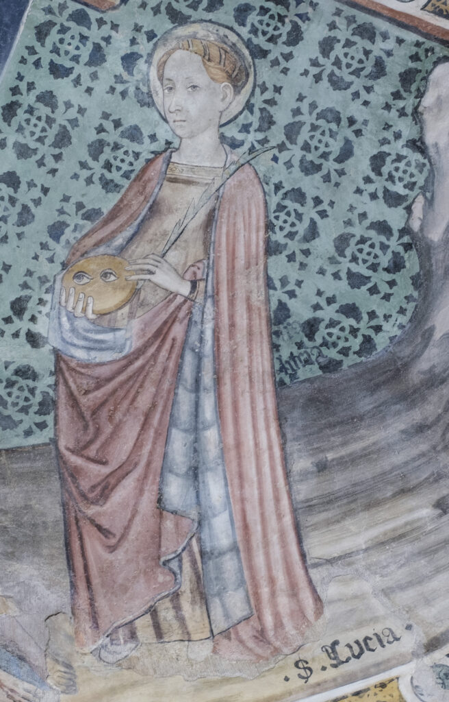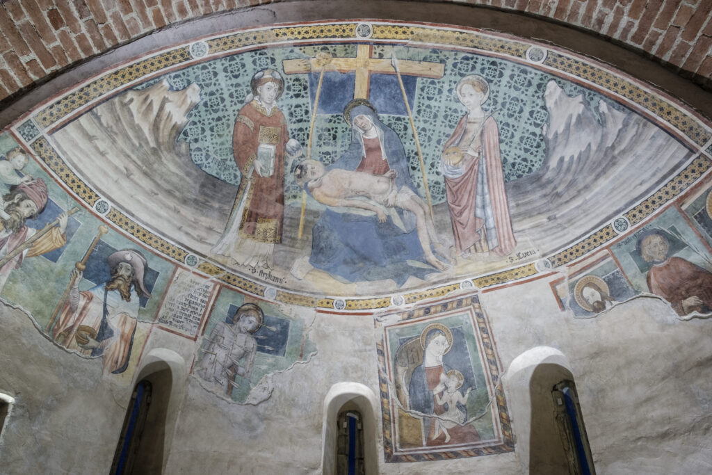 Nel catino è invece dipinto un Compianto sul Cristo Morto con la Madonna che sorregge il figlio, affiancata da santa Lucia e da santo Stefano. Lo sfondo riporta elementi decorativi realizzati con degli stampini con diverse tonalità di verde.