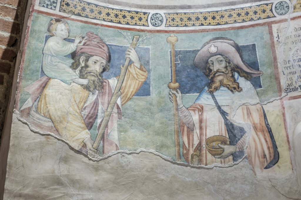 Nel registro inferiore, partendo da sinistra sono raffigurati San Cristoforo con Gesù Bambino sulle spalle e, accanto, San Giacomo. La devozione per questi due santi, protettori dei pellegrini, sottolinea che questa cappella sorta su uno degli itinerari più frequentati in epoca medievale: la Via Francigena.