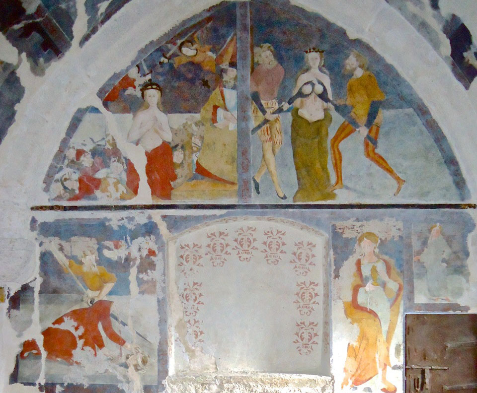 All’interno della cappella, la zona del presbiterio è separata dall’aula di preghiera da una cancellata. La pala d’altare, datata 1672, raffigura le sante Caterina d’Alessandria e Maria Maddalena. Tra il 2009 e il 2013 sono stati condotti alcuni interventi di restauro che hanno permesso di riscoprire un esteso ciclo di affreschi collocato nella zona del presbiterio e datato ai primi decenni del XVI secolo. Sul paliotto d’altare sono emersi lacerti di un affresco che doveva rappresentare Santa Veronica con il telo in lino su cui è impresso il volto di Cristo. Sulle pareti sono invece rappresentati episodi della vita di Santa Caterina d’Alessandria, tratti dalla Legenda Aurea di Jacopo da Varazze, e, in un riquadro, Santa Maria Maddalena con, in mano, la pisside degli oli sacri. Al suo fianco doveva essere stato rappresentato San Francesco d’Assisi, di dimensioni ridotte. A sinistra dell’altare, nel registro superiore, si trova il Salvataggio di Santa Caterina dal supplizio della ruota dentata, a cui era stata condannata dopo aver spinto a convertirsi alla fede cristiana alcuni filosofi della corte dell’Imperatore romano Massenzio. Sulla destra, in alto, il martirio della moglie di Massenzio, Valeria Maximilla, anch’essa convertitasi al cristianesimo dopo l’incontro con Caterina d’Alessandria, che viene quindi martirizzata tramite decapitazione, come si vede nella scena nella zona inferiore, per ordine dell’Imperatore. L’esecuzione degli affreschi, ricchi di dettagli e con un alto grado di realismo – nei volti e in alcuni particolari, talvolta definiti da inserti dorati, è stata ricondotta al pittore di Plampinet, attivo anche in altre cappelle della zona.