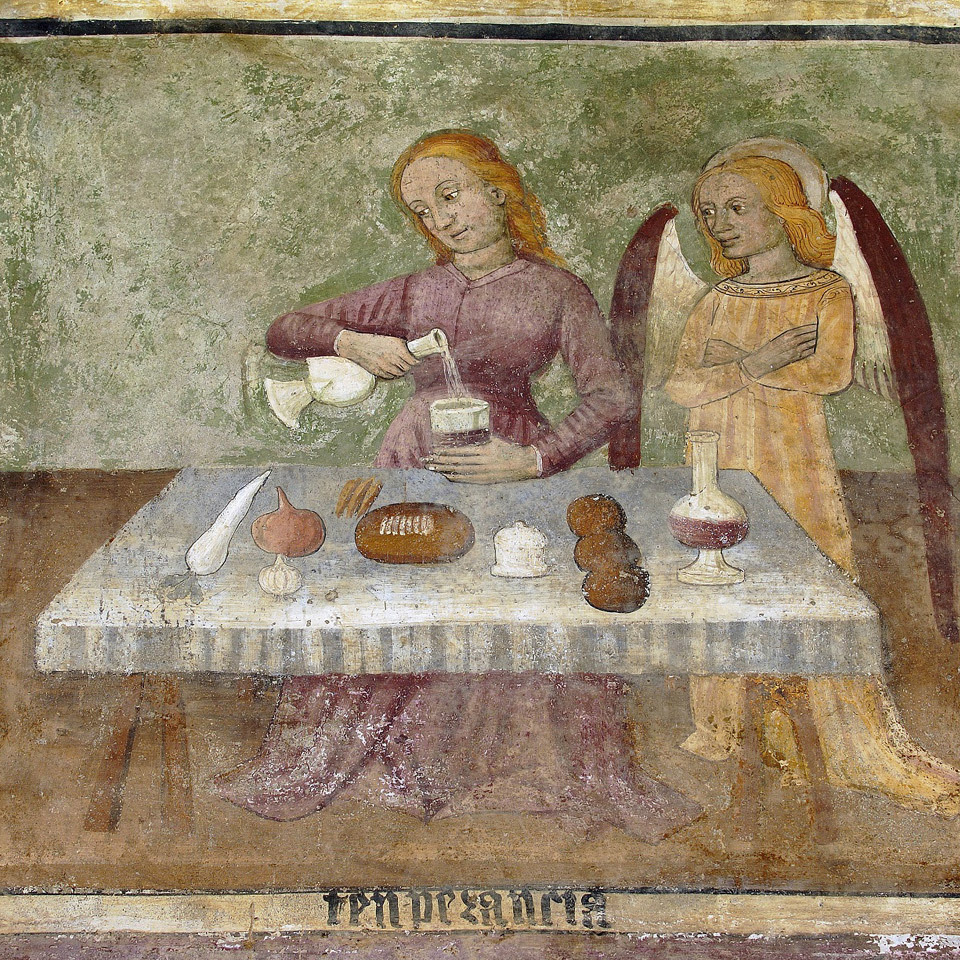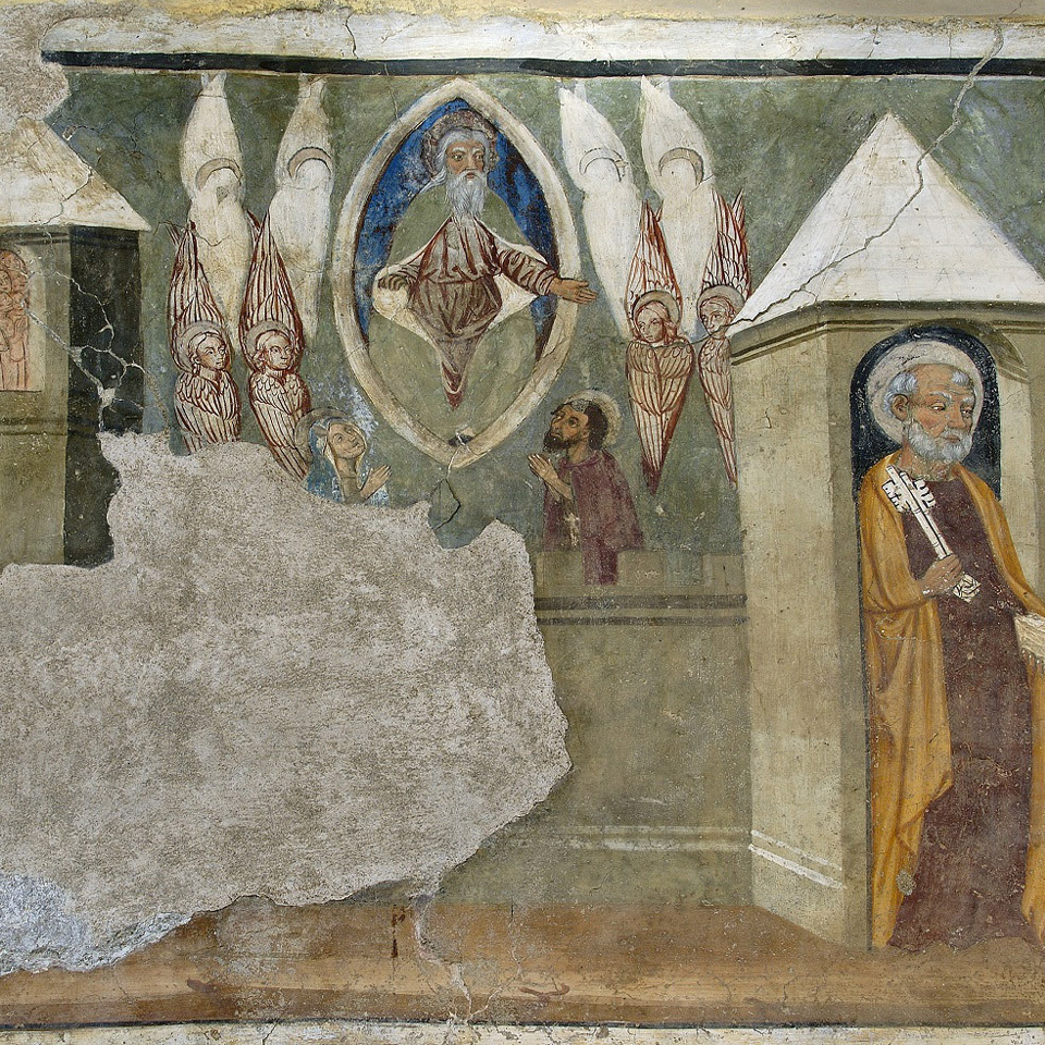 La piccola cappella, risalente al XIII secolo, sorge nel cuore della borgata omonima, collocata nella parte più bassa del territorio giaglionese, ai confini con Susa. L’edificio è costituito da un semplice vano rettangolare con facciata a capanna, sormontato da un campanile moderno in mattoni, mentre la porta d’ingresso è sovrastata da un arco a pieno sesto. L’esterno dell’edificio è decorato sulla facciata settentrionale dal celebre ciclo di affreschi raffigurante la Cavalcata dei Vizi e delle Virtù, tema che godette di una certa fortuna in zona come attestano i casi di Salbertrand, Horres (Millaures) e Novalesa. Gli affreschi sono datati tra il 1483 e il 1490 e sono ricondotti all’attività della bottega dei pinerolesi Bartolomeo e Sebastiano Serra. Le scene si dispongono su tre registri sovrapposti. Nel registro superiore sono raffigurate, in successione da destra verso sinistra, le Virtù accompagnate da figure angeliche. Sulla sinistra della fascia è presente Gerusalemme celeste, presentata come una città turrita al di sopra della quale campeggia, inserita in una mandorla e circondata da serafini, la figura di Dio Padre. San Pietro, che reca tra le mani le chiavi del Regno dei Cieli, campeggia dinanzi alla porta della città. Nella fascia intermedia si succedono, in corrispondenza delle Virtù, i Vizi impersonati da uomini e donne collegati da una catena, accompagnati da diavoli e intenti a cavalcare gli animali che la simbologia associa a ciascuno di essi. L’intero corteo si dirige verso sinistra, dove campeggia la bocca dell’inferno raffigurato come un Leviatano dalle fauci spalancate. Nella fascia inferiore, infine, troviamo rappresentate le pene infernali collegate ad ogni singolo vizio. Due iscrizioni in francese antico campeggiano nel primo riquadro in basso a sinistra e sull’arcone dell’ingresso laterale della cappella. La prima narra al pellegrino l’origine delle raffigurazioni del regno dei morti nel Vangelo. La seconda, invece, di carattere monitorio e in tema con l’iconografia, invita i viandanti a seguire l’esempio dei comportamenti virtuosi.