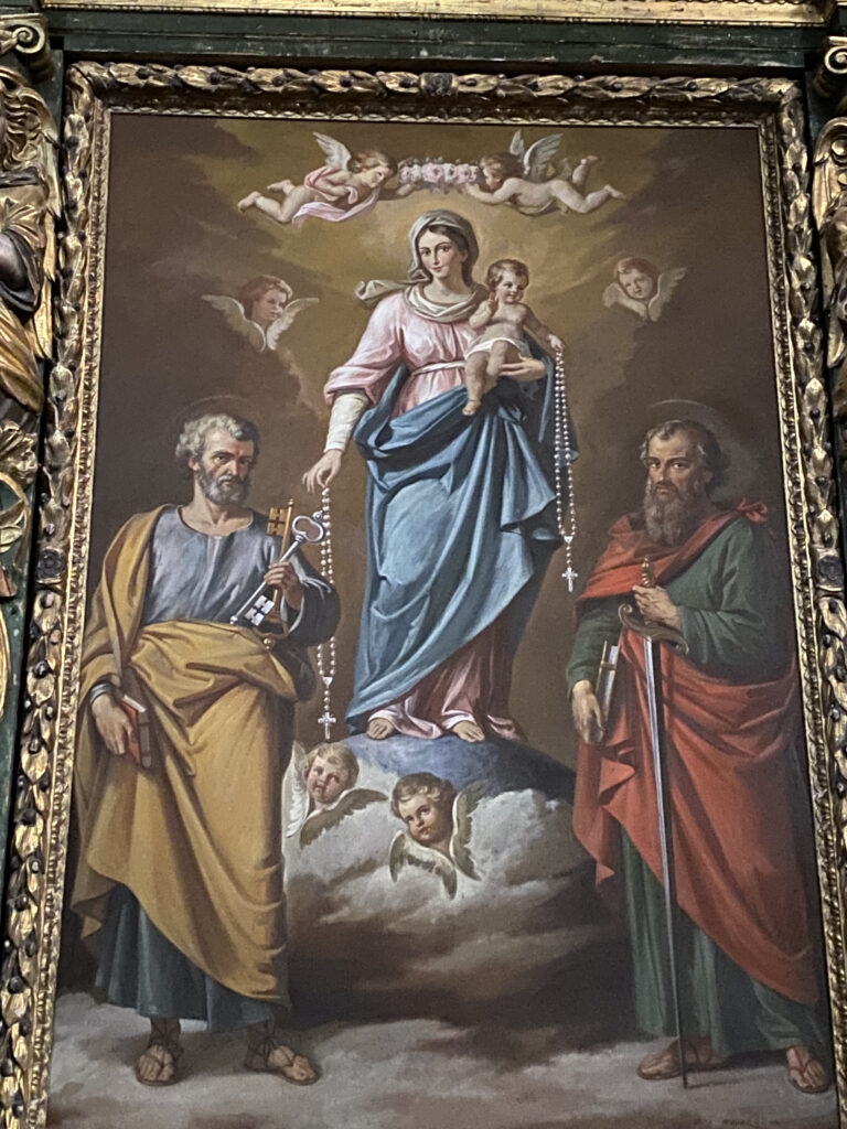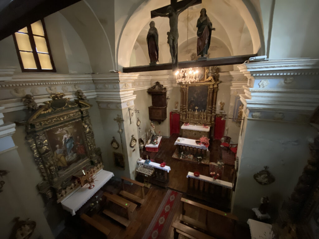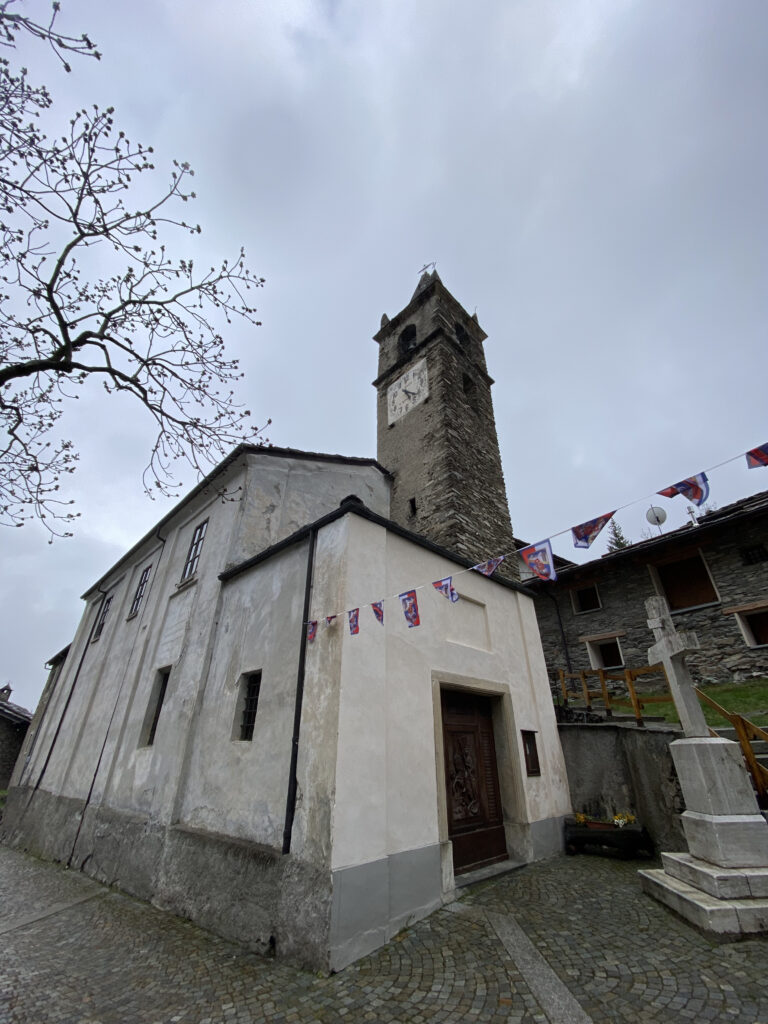 L’area absidale è occupata dal retable intagliato e parzialmente dorato, opera di scuola savoiardo-piemontese di fine XVII – inizio XVIII secolo; l’altare del Rosario ospita un retable a colonne tortili e timpano spezzato di scuola lombardo-piemontese datato al 1683; l’altare di Sant’Antonio ospita un retable a colonne tortili e timpano spezzato intagliato e dipinto opera di scuola savoiarda della seconda metà del Seicento; sullo jubé è presente il complesso del Calvario (XVII secolo). Il portale reca la raffigurazione intagliata di San Giorgio