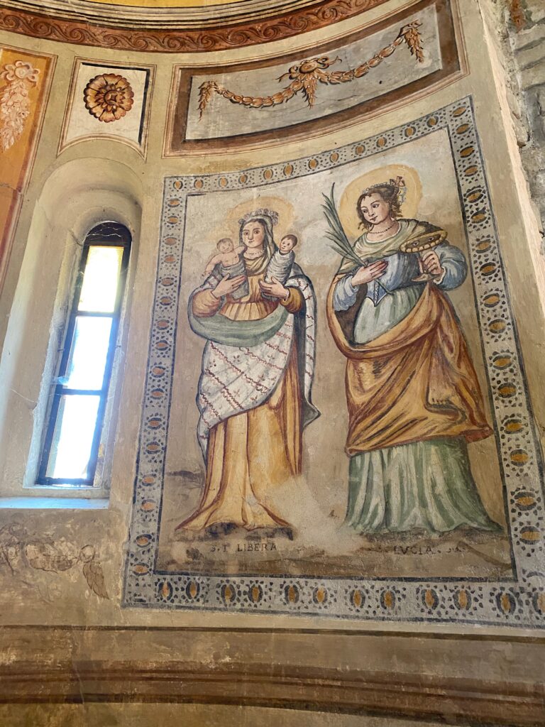 All’interno le pareti risultano decorate da affreschi ottocenteschi di fattura popolare; le figure che compaiono nel catino dell’abside romanica sembrano però ricalcare nell’iconografia precedenti e più antichi affreschi.