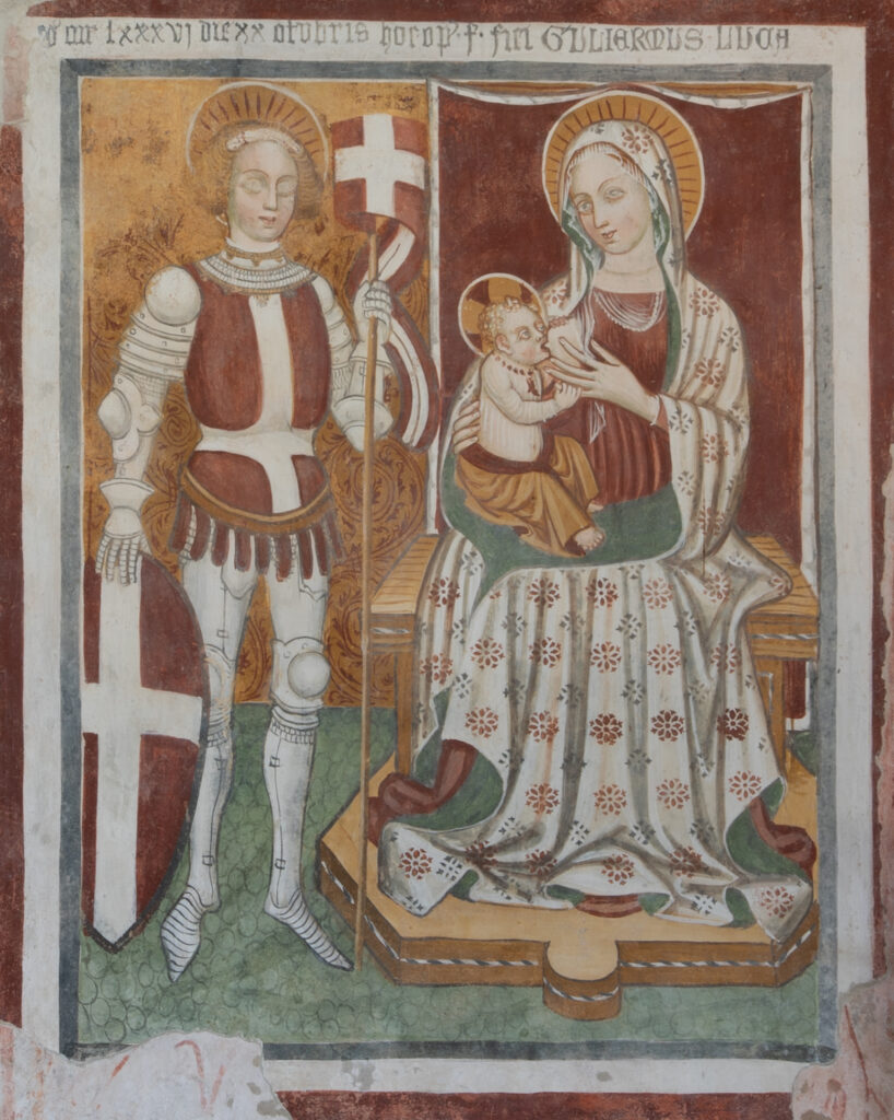 Sulla parete destra: in una bella cornice, la Madonna che allatta con a fianco San Maurizio(?) in abiti da cavaliere, sopra a caratteri gotici data e committente: