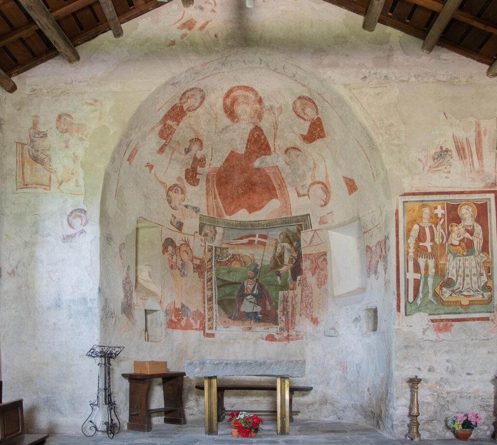 Nell’abside della navata più piccola: gli affreschi sono di epoca romanica bizantina, con l’ampio uso delle ocra gialle e rosse. Raffigurano la serie degli Apostoli assisi, tra cui si riconoscono S. Bartolomeo, S. Giovanni, S. Andrea, S. Pietro e S. Paolo. Al di sopra troneggia la figura del Cristo Pantocratore tra due serafini e i simboli degli Evangelisti: l’angelo S. Matteo, il bue S. Luca, il leone S. Marco, l’aquila S. Giovanni.