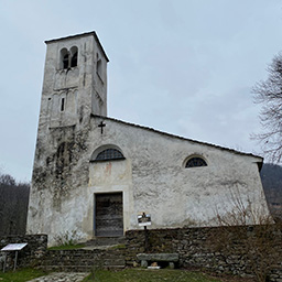 La cappella, forse, in origine dedicata a San Pietro, si erge, oltre l’Ellero, bianca e con il suo tozzo campanile, incorporato nella facciata, sullo sfondo verde dei boschi. La sua costruzione risale all’ XI sec. con l’aggiunta di una navata più ampia intorno al XIV sec.