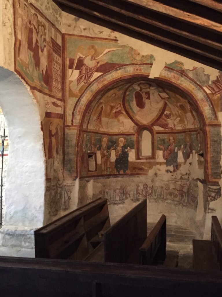 Nella navata maggiore, a frammenti antichi si accostano e si sovrappongono affreschi più tardi: un leone alato, un personaggio seduto e angelo con le ali ripiegate, Adamo ed Eva nell’Eden e la loro cacciata, il sacrificio di Abele ed altri non identificabili.