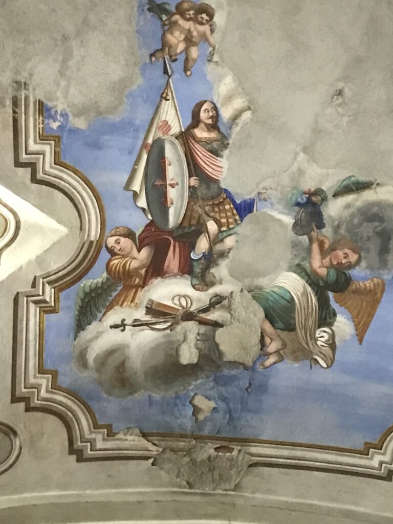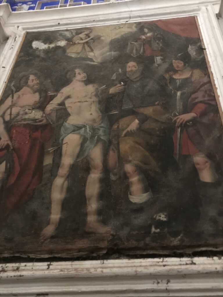 All’interno una tela della prima metà del ‘600 con al centro la figura di san Sebastiano, a cui è dedicata la chiesa. Interessanti le decorazioni pittoriche realizzate nella seconda metà dell’800: i finti cassettoni con al centro delle rosette nei sottarchi e i motivi ispirati a forme vegetali nelle volte.