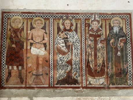 Si tratta di un riquadro diviso in cinque scomparti rettangolari accostati e incorniciati da una linea rossa. Su questa sono presenti i nomi di due santi e la data degli affreschi: 1424. Ciascun soggetto è dipinto in piedi, a figura intera. Si identificano: un giovane santo, san Sebastiano, la Madonna col Bambino, sant’Eusebio e sant’Antonio Abate.