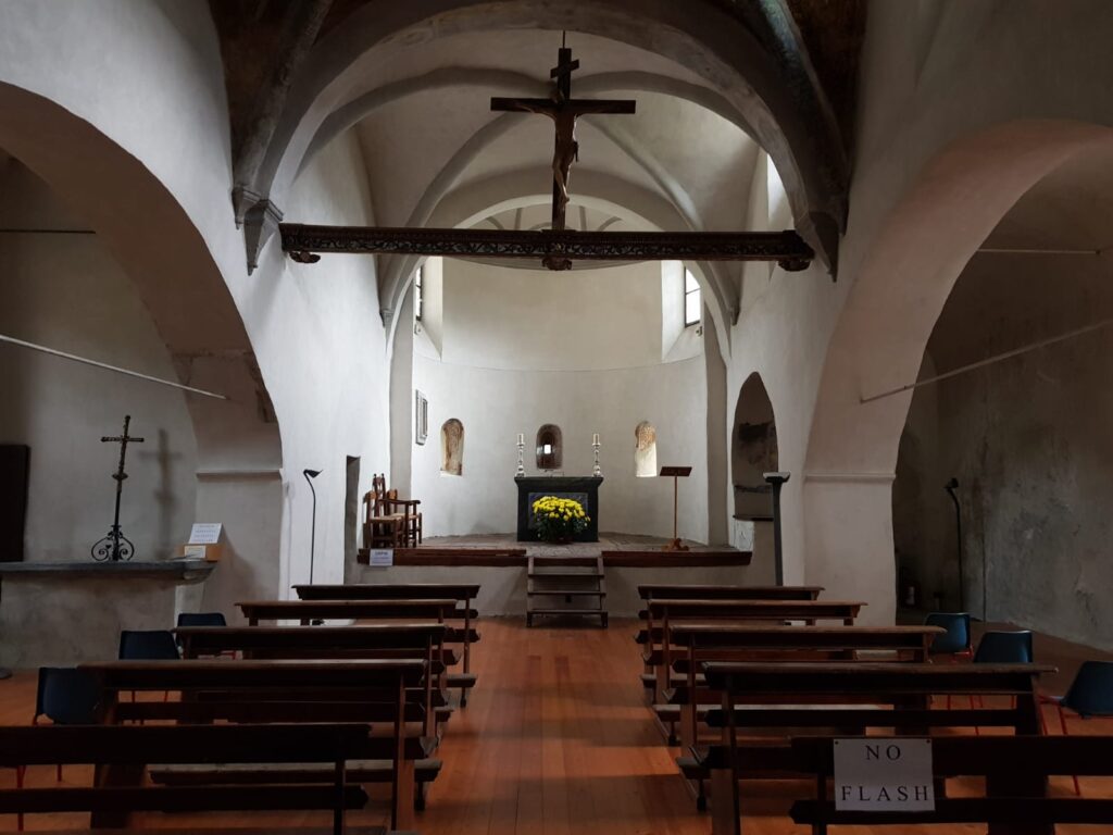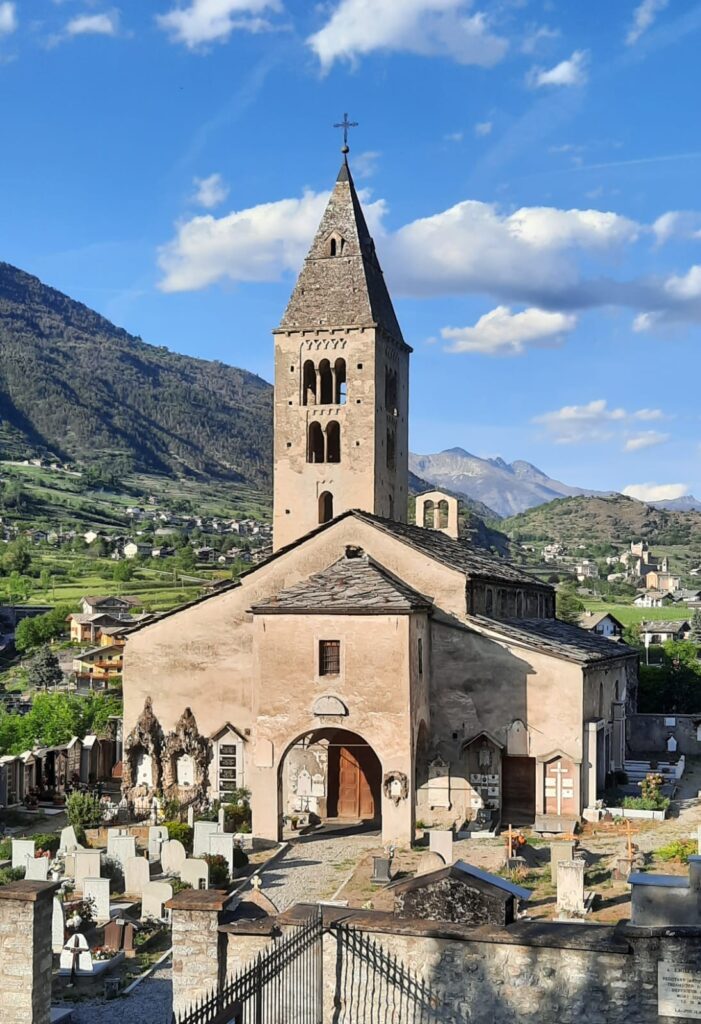La Chiesa di Santa Maria e San Rocco a Villeneuve è stata costruita alla metà dell’anno 1000 su una più antica chiesa altomedievale, fabbricata, a sua volta, su un complesso di edifici paleocristiani risalente al V secolo, dove si trovava anche una grande vasca ottagonale per il battesimo a immersione, come era prassi nelle prime comunità cristiane. Villeneuve fu un luogo importantissimo per la cristianizzazione del territorio dell’alta valle, posto lungo la via che conduceva verso le Gallie. All’interno, la chiesa si divide in tre navate, tra loro separate da ampi archi ottenuti nel Cinquecento a seguito della demolizione di due pilastri romanici. Le pareti erano ricoperte da dipinti murali realizzati da artisti che hanno lavorato anche nei castelli della Valle d’Aosta.