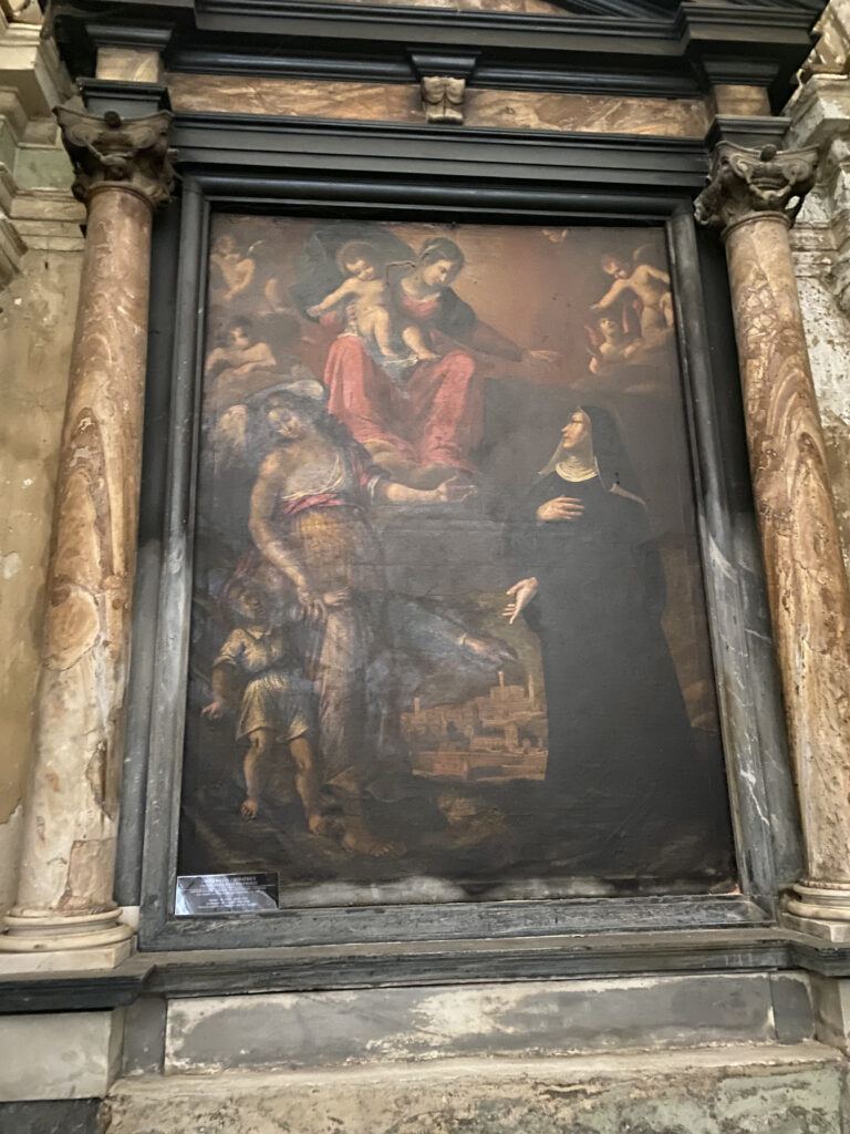Proseguendo sul lato destro della chiesa, dopo il pulpito ligneo, possiamo ammirare una pala d’altare datata 1888 e firmata dal pittore torinese Cesare Marietti, raffigurante San Giuseppe e Gesù Bambino. Il dipinto è impreziosito da una cornice intagliata e dorata, mentre i personaggi, san Giuseppe a figura intera che regge tra le braccia il Bambino benedicente, sono inseriti entro una struttura architettonica a volta sorretta da quattro pilastri poggianti su base circolare con capitello ionico composito. Sullo sfondo, in basso a sinistra, è raffigurata la città di Pinerolo con lo svettante campanile della chiesa di San Maurizio.