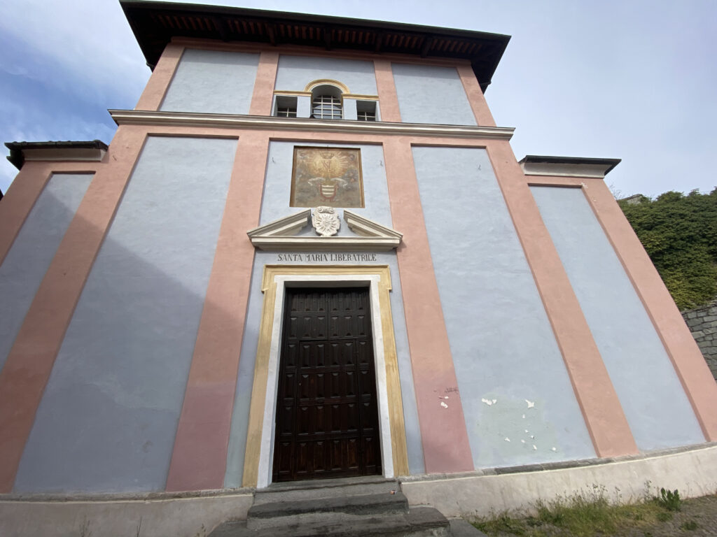 Agli stessi maestri luganesi appartiene la decorazione della prima cappella sulla destra, i cui stucchi rimandano a quelli presenti nell’altare maggiore, specie la somiglianza tra il putto ligneo dorato proteso verso il cartiglio del frontone dell’altare maggiore e quelli collocati sul fastigio di questo altare del Crocifisso, seduti uno di fronte all’altro sul frontone sovrastante la cornice della pala d’altare. Quest’ultima, realizzata intorno alla metà del XVII secolo da un pittore di scuola piemontese, raffigura Cristo crocifisso con ai suoi piedi le pie donne. La decorazione della volta si presenta invece tripartita da pannelli incorniciati con sculture ornamentali e dipinti color ocra. Ai lati sono presenti pannelli rettangolari con angoli riquadrati aggettanti su fondo ocra con cornice interna foggiata a pallini e cornice interna con motivo vegetale, entrambe colorate di bianco. Il pannello centrale a sezione ottagonale è composto da cornici di analoga fattura sostenute da puttini e adorno da molte testine di cherubini con festoni vegetali. Sulla sinistra della cappella è presente un’acquasantiera, opera di bottega piemontese datata 1586. Presumibilmente l’opera era collocata nel distrutto monastero di Santa Brigida o nella chiesa della Consolata, ampliata per costruirvi la più spaziosa chiesa di Santa Maria Liberatrice.