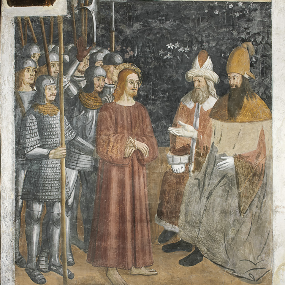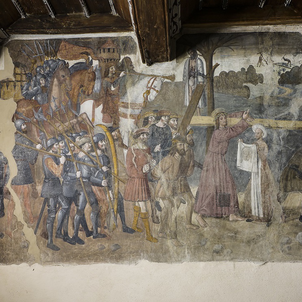 L’oratorio di San Francesco occupa un edificio nato probabilmente ad uso civile, successivamente riconvertito a sede della Confraria di Santo Spirito. Questa esisteva almeno dal 1225, anno in cui l’istituzione riceve un legato testamentario e quando i locali collocati al piano superiore erano verosimile utilizzati “pro reponendo de feno”. Non è noto il momento in cui la confraternita cambiò intitolazione a favore di San Francesco: secondo alcuni studiosi questo evento sarebbe da collocarsi poco prima della lettera patente del vescovo astigiano Scipione Rotario, datata 1 marzo 1535, in cui si approvano i privilegi già concessi alla confraternita e si concede facoltà di trasformare l’oratorio da semplice luogo di ritrovo e di preghiera a vera e propria chiesa. L’edificio presenta un impianto planimetrico rettangolare che nel settore nord termina con un’abside e nel settore sud con un avancorpo rialzato che include un campanile a base quadrata, un tempo abbastanza elevato e utilizzato come torre difensiva della “porta Solani”. L’ingresso è collocato sul lato orientale. Le pareti interne sono quasi integralmente coperte da trentaquattro metri di affreschi, raffiguranti scene della Passione di Gesù. Il ciclo è stato commissionato dai confratelli, a seguito della parziale ristrutturazione interna della loro “casa” in forma di oratorio, avviata negli anni ’90 del Quattrocento e completata negli anni ’30 del secolo successivo. La narrazione ha inizio sulla parete posta in corrispondenza dell’ingresso con due brani riferiti all’Entrata di Gesù in Gerusalemme e si conclude sul lato opposto con la Resurrezione. Il ciclo attribuito al Maestro di Santa Vittoria d’Alba, sembra mostrare un forte debito nei confronti del Maestro di Sant’Anna di Cercenasco ed essere accostabile alla tela raffigurante la Madonna della Misericordia, conservato presso la cappella della Madonna degli angeli ad Alba e datato intorno al 1480. L’altare era ornato da un’ancona raffigurante la Madonna col Bambino e i santi Francesco e Vittoria, attribuita alla bottega di Macrino d’Alba, oggi conservata presso la vicina chiesa parrocchiale di Maria Vergine Assunta.