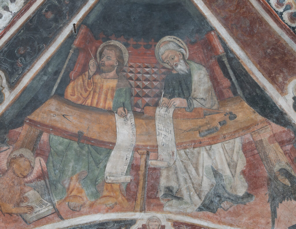Infine nella vela sinistra sono dipinti gli altri due, Matteo e Luca, affiancati dall’asino e dal bue.