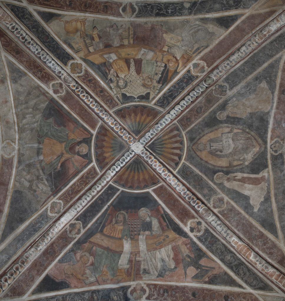 Alzando gli occhi in alto, verso la crociera, si possono ammirare gli affreschi realizzati da un anonimo maestro nella seconda metà del Quattrocento. Si articolano in quattro scene inquadrate in costoloni e cornici decorative floreali a tinte sfumate, inframezzate da particolari figure geometriche definite tondi polilobati.